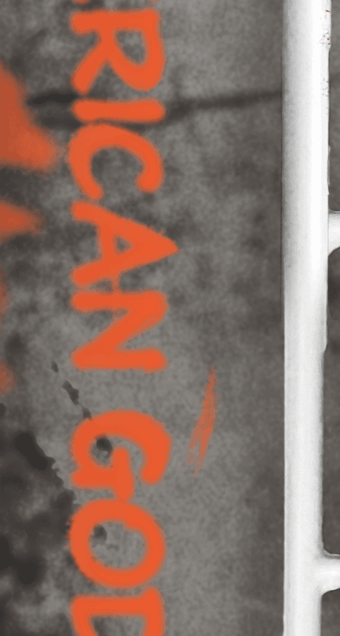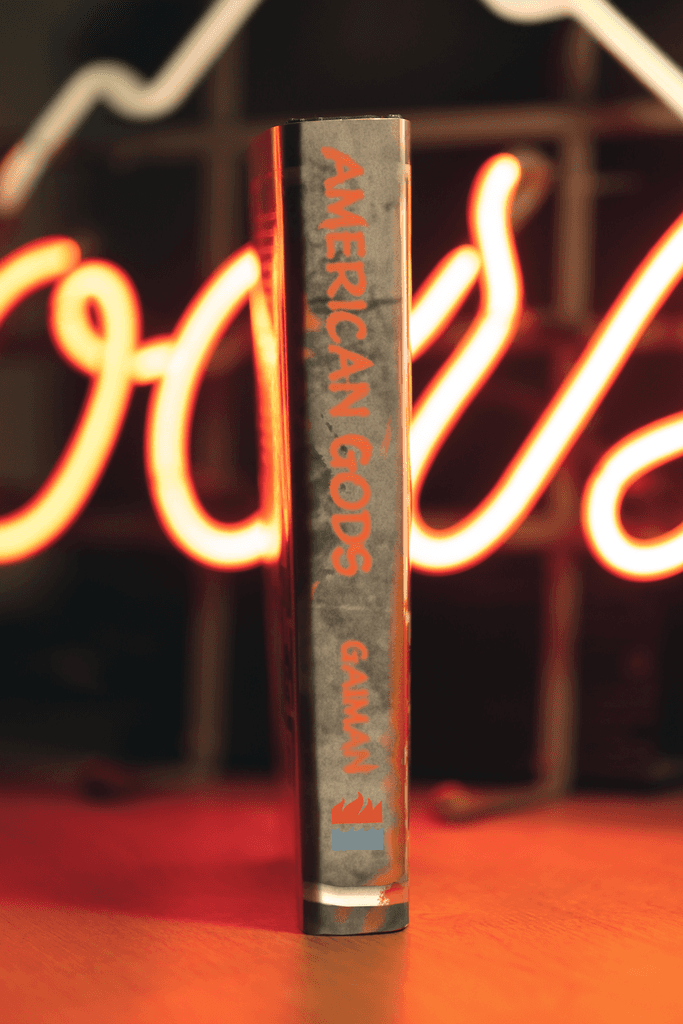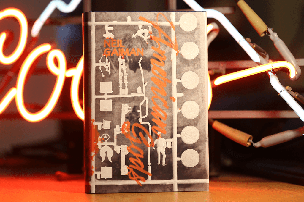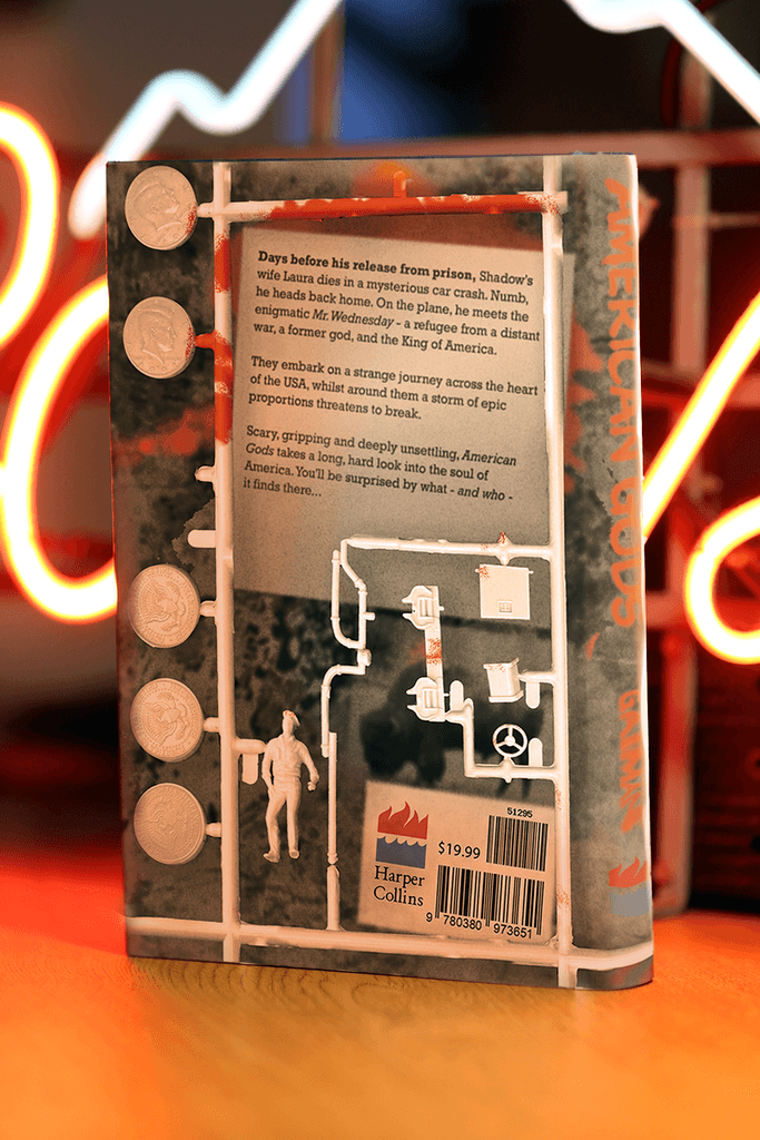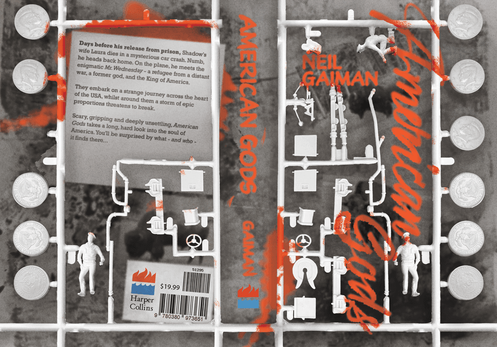Digital illustration for the book cover of American Gods by Neil Gaiman. The book cover expresses the absurdist and dark tone of the book with a bizarre plastic model kit, referencing both the roadtrip that is the book's central plot and also the feeling that things are not what they appear that informs the book's tone.