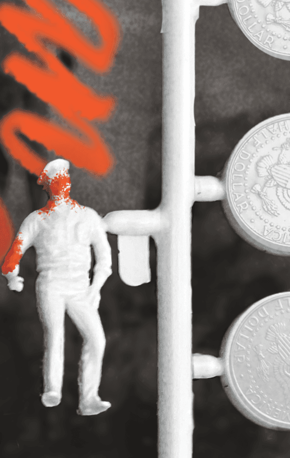 Inspired by Dadaist readymades, I used a store-bought model to create a photo collage. I incorporated surreal elements like quarters in the model frame, and digitally rendered the title as spray paint.